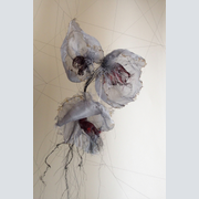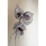 Dans cette installation, j’ai choisi de mettre en scène les fleurs, suspendues au bout de fil de soie, sortant du cadre convenu, dans une fragilité qui masque la puissance de leurs pouvoirs.